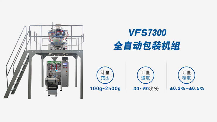 VFS7300全自動包裝機組是由VFS7300立式充填包裝機、組合秤和輸送機組成,集稱量、制袋、折邊、充填、封口、打印、沖孔、計數(shù)于一體,采用伺服電機同步帶拉膜,具有自動糾偏功能。廣泛應用于花生、茶葉、種子等顆粒物包裝。