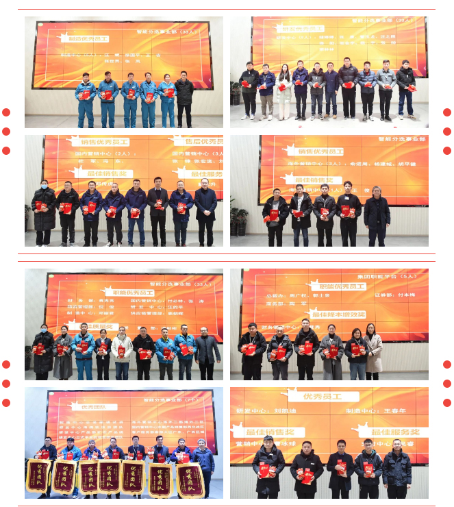 2月1日,以“穩(wěn)增長、謀突破、聚共識、 拼實(shí)干”為主題的泰禾智能集團(tuán)2024年新春大會在總部隆重召開。集團(tuán)總裁魏先彪、智能分選事業(yè)部總裁石江濤、集團(tuán)財務(wù)經(jīng)營中心總監(jiān)黃慧麗及各業(yè)務(wù)線管理層、優(yōu)秀員工代表薈聚一堂,共同回首2023,展望2024。董事長許大紅線上參會。