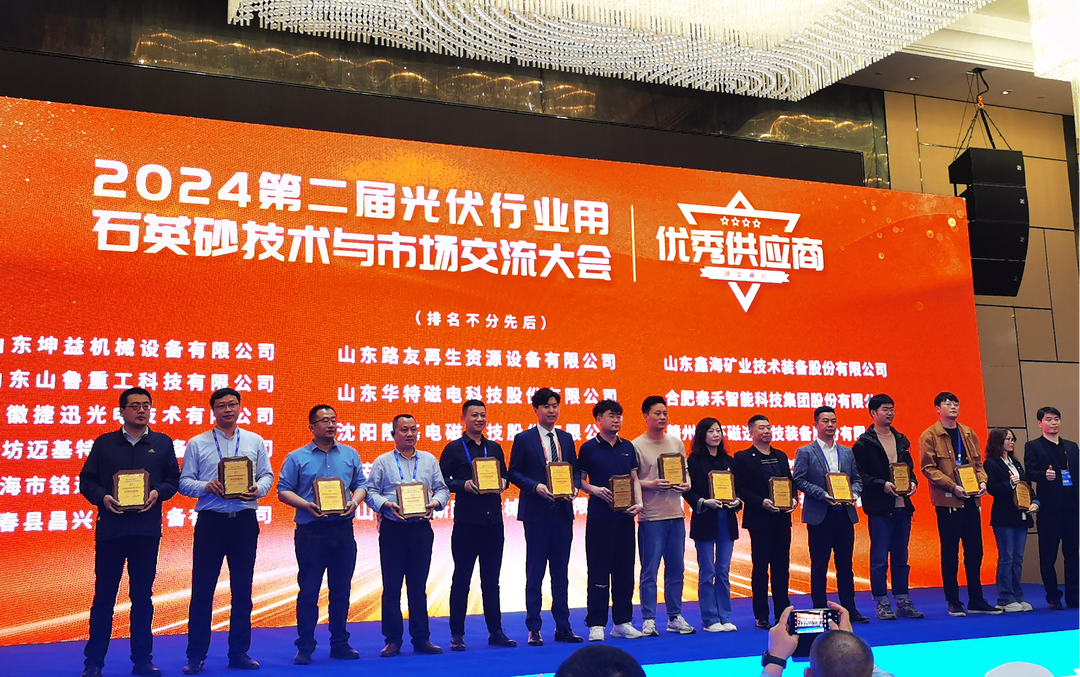 2024年3月29日,泰禾智能受邀參加第二屆光伏行業(yè)用石英砂技術(shù)與市場交流大會,并榮獲“優(yōu)秀供應(yīng)商”大獎。作為礦石分選領(lǐng)域的代表企業(yè),泰禾智能一直致力于石英砂尖端分選技術(shù)的開發(fā)和高端分選裝備的應(yīng)用推廣。