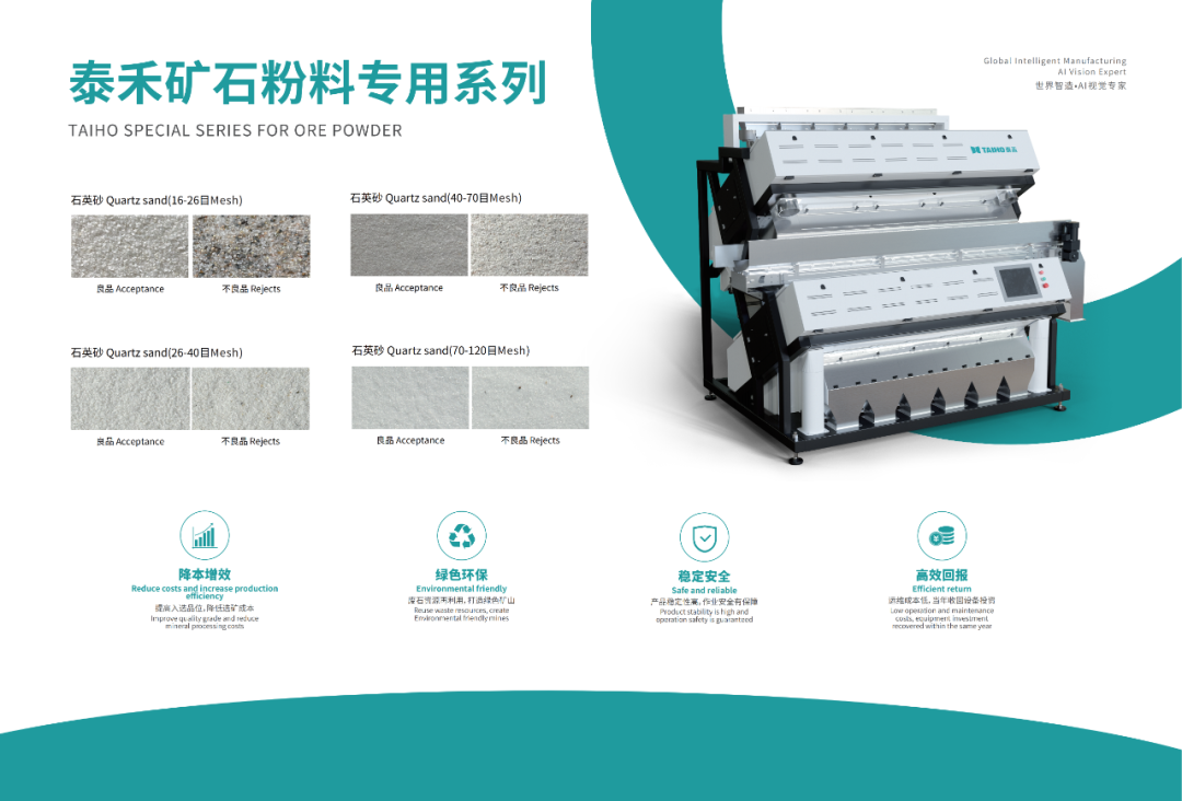 在光伏用石英砂的需求量穩(wěn)步增加的大背景下,我國目前卻面臨著石英坩堝內(nèi)層砂依賴進口、光伏玻璃超白砂大規(guī)模供應(yīng)瓶頸等一系列卡脖子問題。而泰禾智能深耕礦石分選領(lǐng)域多年,從技術(shù)和應(yīng)用端口極大地解決了石英砂原料物理提純的痛點難題。