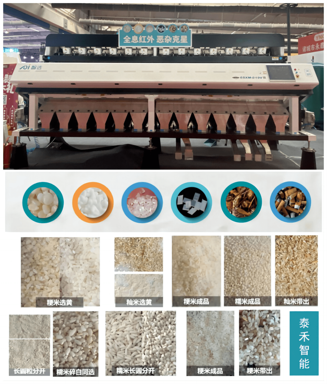 展會(huì)當(dāng)天,泰禾智能展臺(tái)人頭攢動(dòng),備受客戶關(guān)注的AI智選天眼色選機(jī)擁有3.5億像素超清影像+類太陽光譜技術(shù),實(shí)現(xiàn)360度多維成像,搭載AI自協(xié)同傳感平臺(tái),匹配軍工級通訊系統(tǒng),標(biāo)配多譜共焦技術(shù),實(shí)現(xiàn)對大米中玻璃、干燥劑、透明塑料粒子有效剔除。