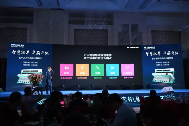 泰禾光電顏天信董事、唐麟董事及來自堅(jiān)果炒貨行業(yè)的領(lǐng)導(dǎo)、嘉賓朋友們等齊聚一堂,共同見證了泰禾光電2018智華系列新品色選機(jī)的揭幕和賦能無限價(jià)值的震撼魅力。